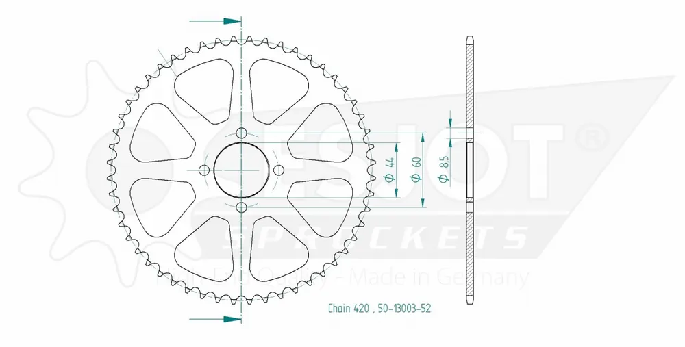 De ESJOT REAR STEEL 52T, 420 heeft 52 tanden en een diameter van 420, waardoor het een uitstekende keuze is voor verschillende motoren en scooters.