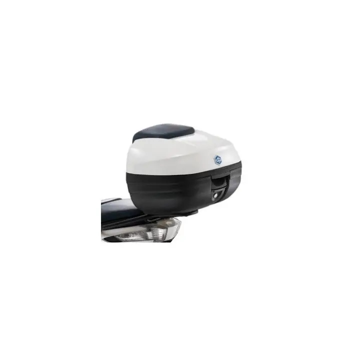 Complete topkoffer set met snel sluit systeem en bevestigingsmateriaal. Kan 1 integraalhelm in worden opgeslagen. Cover past bij de kleur van de motorscooter. Voorzien van een rugsteun in de kleur zwart voor meer passagier comfort.