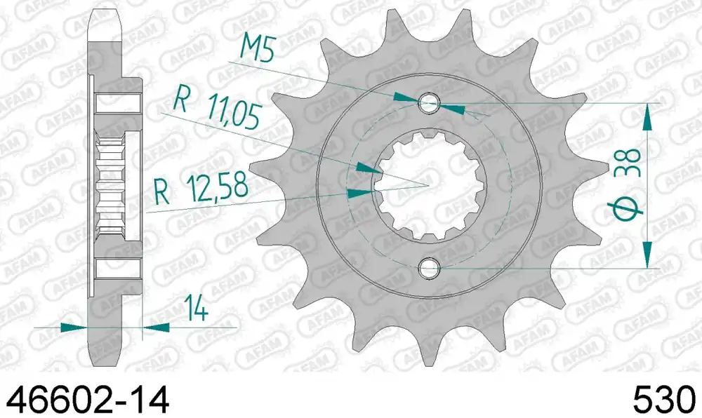 De AFAM FRONT 14T, 530 is ontworpen met de 530-specificatie, wat betekent dat hij compatibel is met een breed scala aan motoren en scooters. Zorg ervoor dat je de maat en specificaties van je huidige sprocket controleert voor een optimale pasvorm.