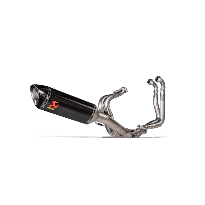 De combinatie van race-bewezen, lichtgewicht materialen, uitzonderlijke productiekwaliteit, perfect ontwerp, geweldig geluid en topprestaties maakt deze uitlaat een must-have voor veeleisende rijders die het beste eisen. Het is geconstrueerd met een buitenste huls en eindkap van de uitlaatdemper van koolstofvezel, met een volledig titanium verbindingspijp en binnenste demperstructuur, afgestemd op een hoogwaardige titaniumlegering voor de headers en collectoren, wat resulteert in een volledig systeem dat 44% lichter is dan voorraad. Dit racebaan-georiënteerde systeem is ontwikkeld voor gebruik op wedstrijdcircuits met gesloten banen en vereist het verplicht opnieuw toewijzen en verwijderen van de passagiersvoetsteun. Het levert een toename van vermogen en koppel van 4,0 kW (5,4 pk) bij 13.000 tpm en 3,8 Nm bij 7.700 tpm, gemeten in back-to-back vergelijkingen met een Aprilia RSV4 met een standaard voorraadsysteem op de interne dyno. Dit race-ontwikkelde systeem levert een onderscheidend diep, sportief geluid, dat het Akrapovič-karakter perfect onderschrijft.