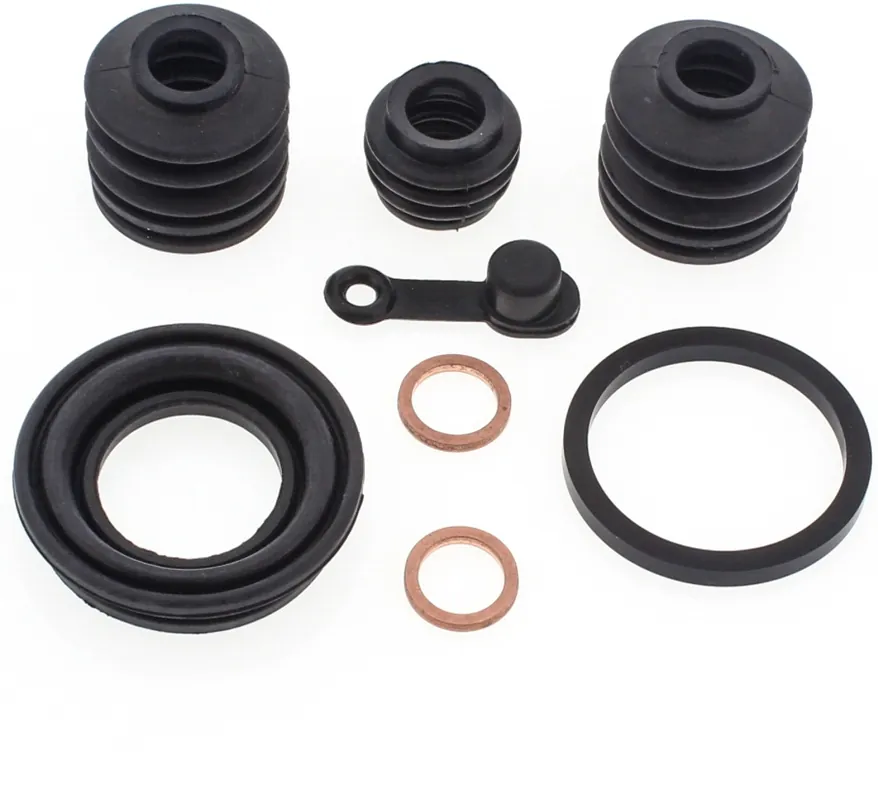 De kit bevat alle benodigde onderdelen voor het renoveren van de remklauw, zoals afdichtingen en andere cruciale componenten.