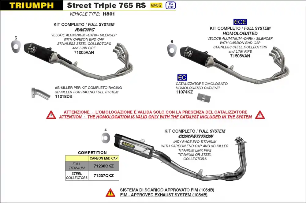 De ARROW Competition Full System in titanium is een hoogwaardige uitlaat die speciaal is ontworpen voor de Triumph Street Triple 765 RS P en RS R. Deze uitlaat biedt niet alleen een indrukwekkend design, maar ook uitzonderlijke prestaties. De constructie van titanium zorgt ervoor dat het systeem lichtgewicht is, wat bijdraagt aan een betere handling van je motor.