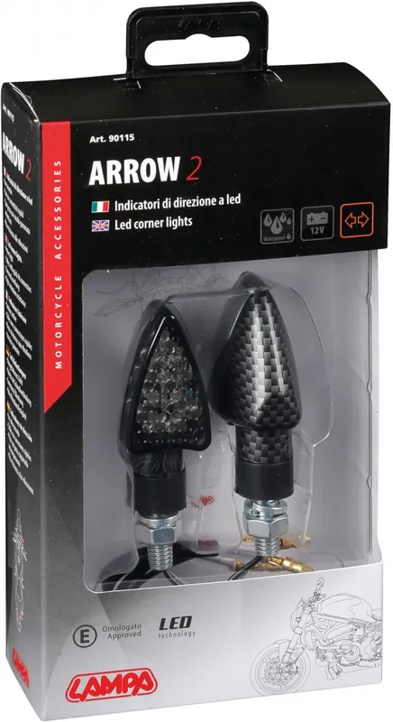 De ARROW-2 LED corner lights van LAMPA zijn de ideale keuze voor iedereen die zijn motor of scooter wil voorzien van een moderne en veilige indicator. Deze 12V LED-verlichting met een stijlvolle carbon afwerking biedt niet alleen een strakke uitstraling, maar ook uitstekende zichtbaarheid op de weg.