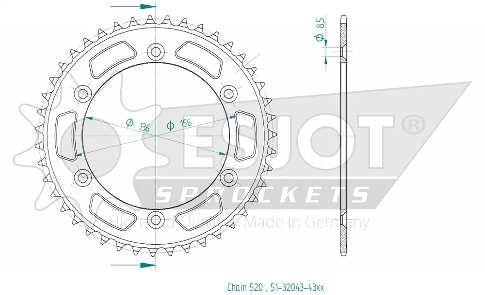 Beperkte Voorraad ESJOT – REAR ALU 43T, 520 – Sprockets – Aluminium, 43T