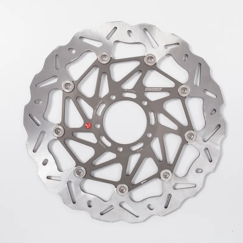 De golfvorm van de BRAKING SK2 330 biedt niet alleen een esthetisch aantrekkelijke look, maar verbetert ook de koelcapaciteit van de remschijf. Dit resulteert in minder vervorming en meer stabiliteit tijdens het remmen. De zwevende constructie zorgt voor een betere schokabsorptie, wat bijdraagt aan een soepeler remgedrag.