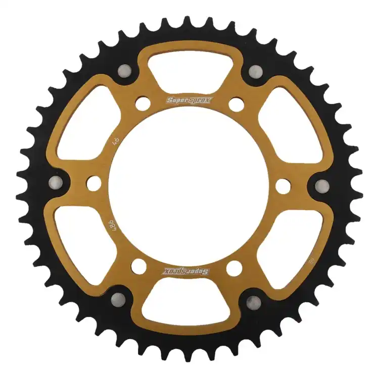 De SUPERSPROX REAR STEALTH 46T biedt een perfecte mix van stijl en prestaties. Het gouden ontwerp zorgt niet alleen voor een visueel aantrekkelijke look, maar het verhoogt ook de functionaliteit van je motor.