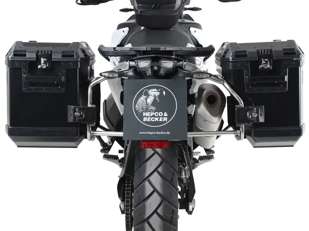 Complete zijkofferset van het kwaliteitsmerk Hepco & Becker, bestaand uit een RVS kofferrek en een set Xplorer zijkoffers (40/37 liter).