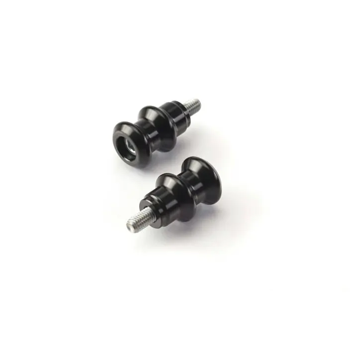 Fraaie zwarte Triumph bobbins waarmee de motor op een paddockstand gezet kan worden.