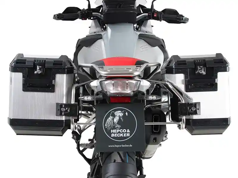 Complete zijkofferset van het kwaliteitsmerk Hepco&Becker, bestaand uit een RVS kofferrek en een set Xplorer zijkoffers (37/40 liter).
