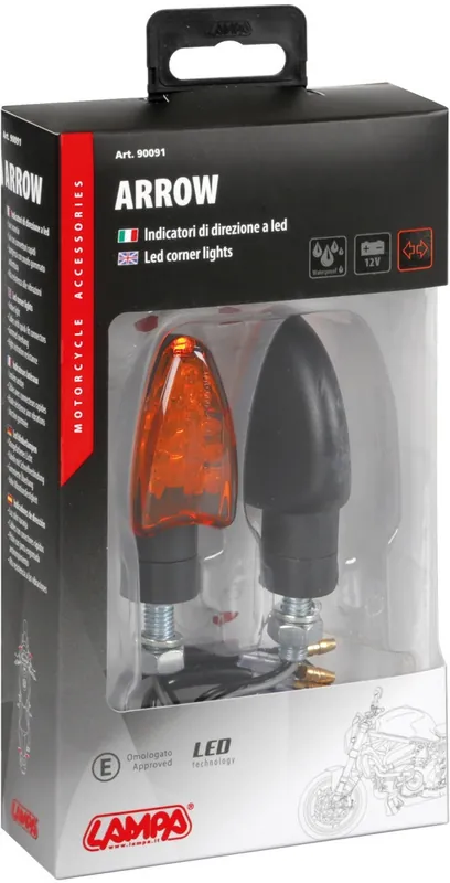 De LAMPA ARROW corner lights zijn een uitstekende keuze voor iedereen die zijn motor of scooter wil voorzien van krachtige en betrouwbare verlichting. Deze indicatoren zijn uitgerust met 12V LED technologie, wat zorgt voor heldere en goed zichtbare signalen tijdens het rijden. Dankzij het zwarte ontwerp passen ze perfect bij verschillende voertuigstijlen.