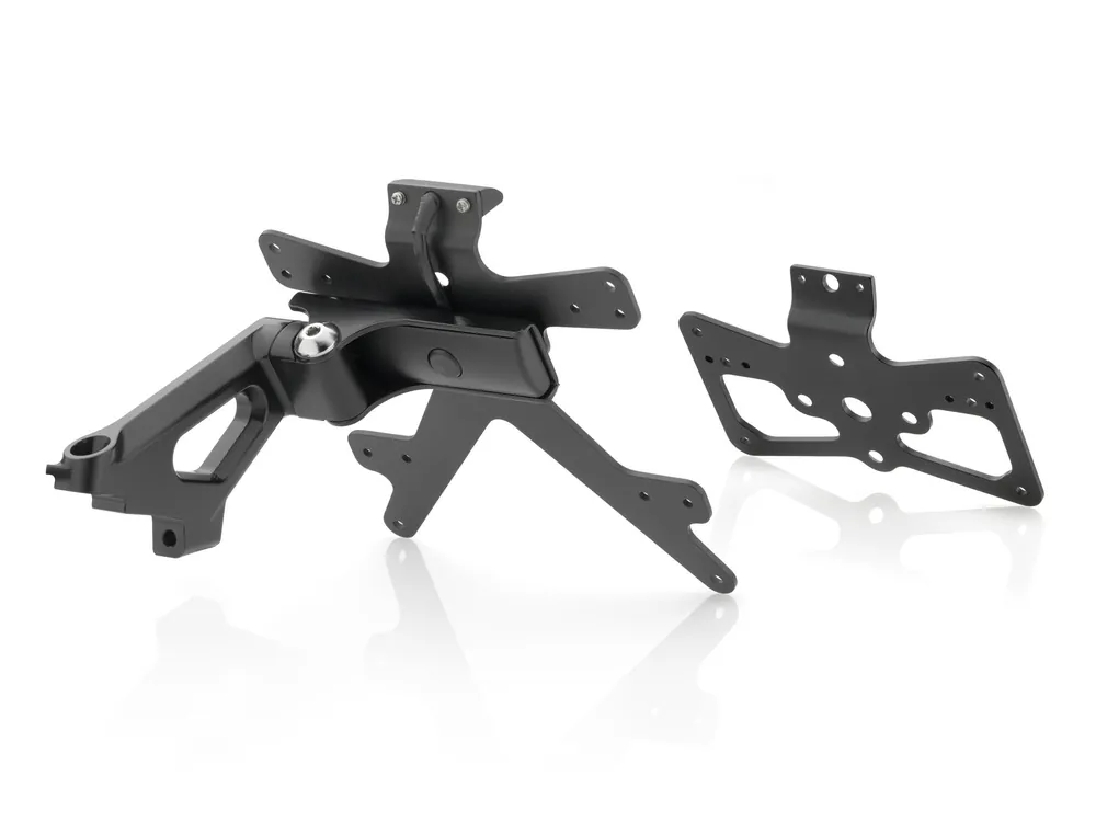 De “Outside” kentekenplaathouderkit met bevestiging op swingarm, inclusief kentekenplaatverlichting.