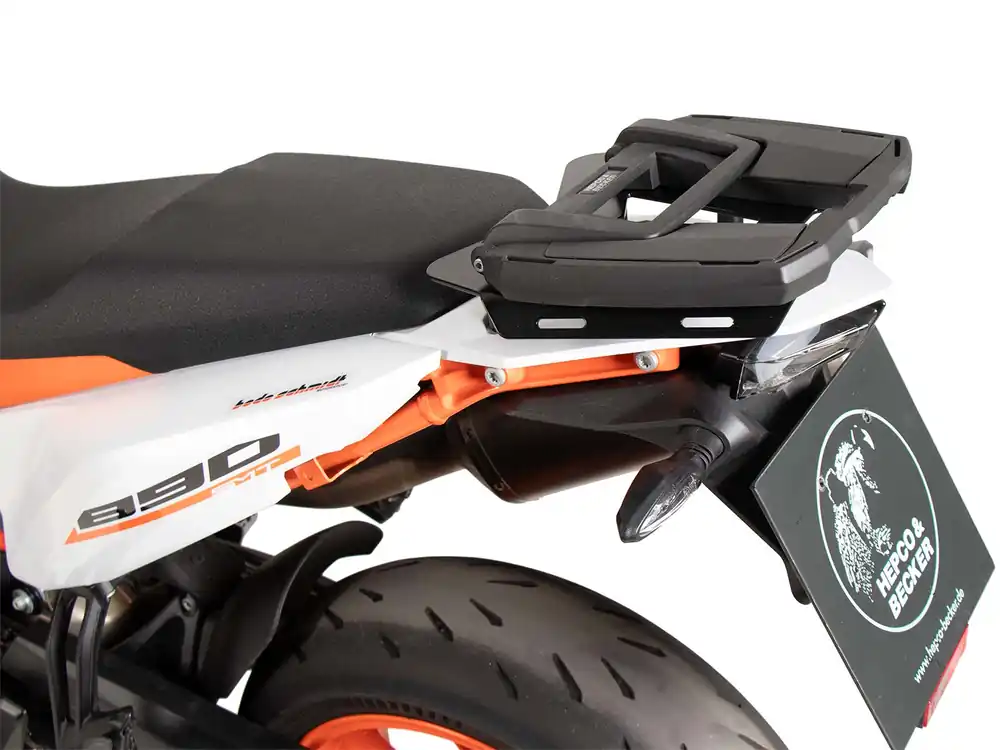 Zeer stabiele drager met klapbare opstaande beugel voor topkoffer van Hepco & Becker vervaardigd uit hoogwaardig aluminium in de kleur zwart.