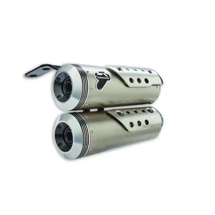 Details en prestaties. Geproduceerd door Termignoni en geven de motorfiets een meer iconisch en elegant uiterlijk en transformeren de look van de achterkant. Ze verbeteren het vermogen en de output van de motor bij lage toerentallen dankzij grotere spruitstukken en speciale motormapping. Ze geven de tweecilinder een doorslaggevend en uitgesproken geluid, in puur Italiaanse stijl.