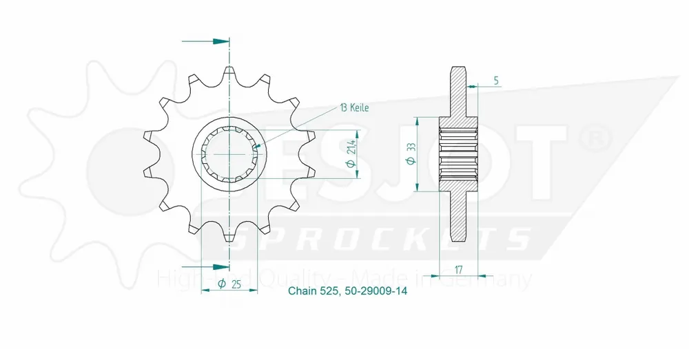Met de ESJOT FRONT 14T, 525 profiteer je van een uitstekende afstemming op je motor, wat zorgt voor een efficiënte vermogensoverdracht. Daarnaast is het materiaal van deze sprocket ontworpen voor een lange levensduur, zodat je minder vaak onderdelen hoeft te vervangen.
