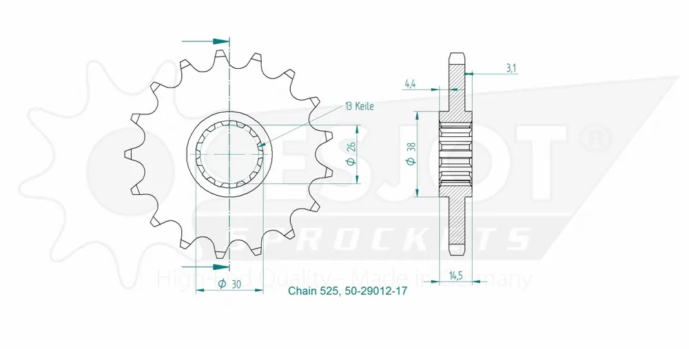 Hier zijn enkele specificaties van de ESJOT FRONT 17T, 525 sprocket: