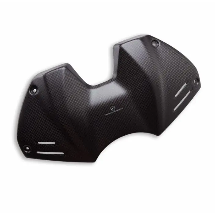 Een prachtig detail dat de voorkant van de Panigale-tank verfraait op een manier die alleen koolstofvezel kan. De afwerking en lijnen van dit accessoire zijn perfect geïntegreerd in de race-look van de motor bij uitstek.