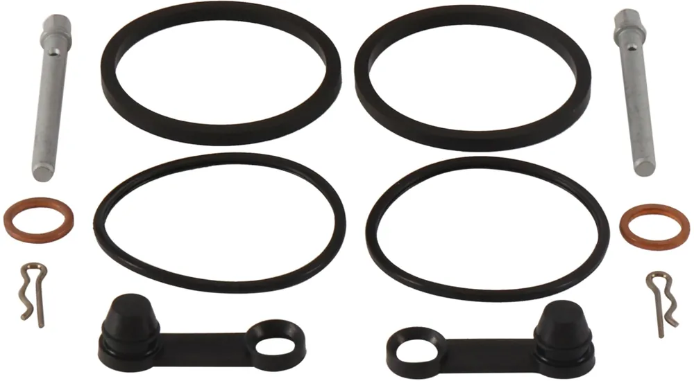 De kit bevat alle essentiële onderdelen die nodig zijn voor het repareren van de remklauw, zoals pakkingen en andere benodigde componenten.
