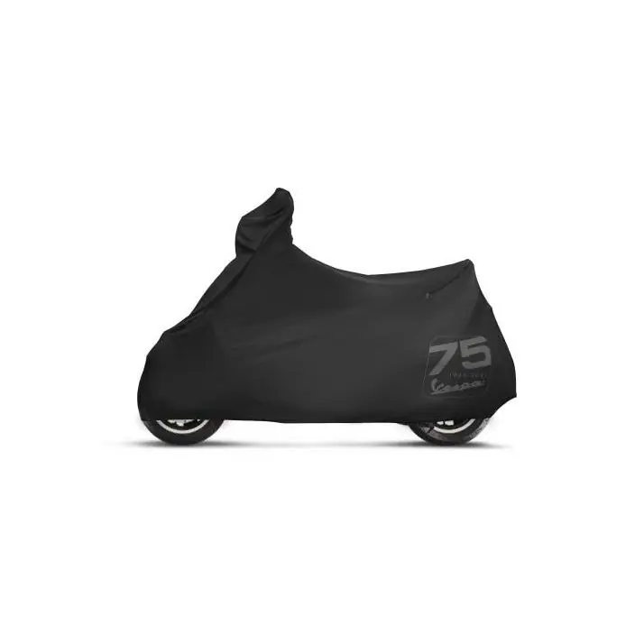 Vespahoes voor binnen gemaakt van waterdichte stof, thermisch getapete naden. Op maat gemaakte basis op de carrosserie van de scooter, met vak voor accessoires om een perfecte pasvorm te garanderen Reflecterend logo Vespa 75th Anniversary als een exclusief tintje