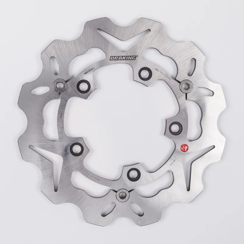 De golfvorm en de semi-vloeiende constructie zorgen voor een optimale afvoer van warmte en verbeterde grip, wat uniek is voor deze remschijf.