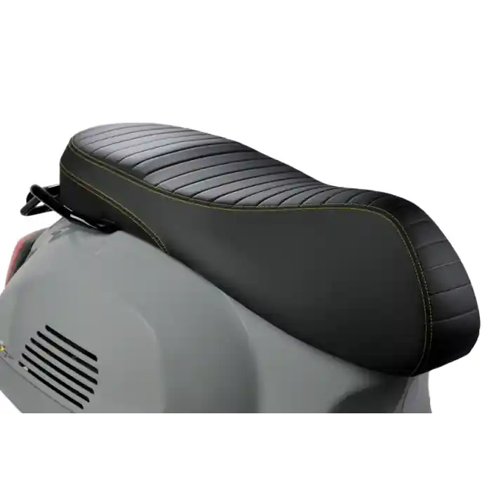 Sportzadel dubbel zitvlak gemaakt van hoogwaardig materiaal. Mannelijkvlak oppervlak verrijkt met gele naden op buitenzijde. Een delicate en verfijnde manier om het sportieve uiterlijk van de Vespa GTS te verbeteren.