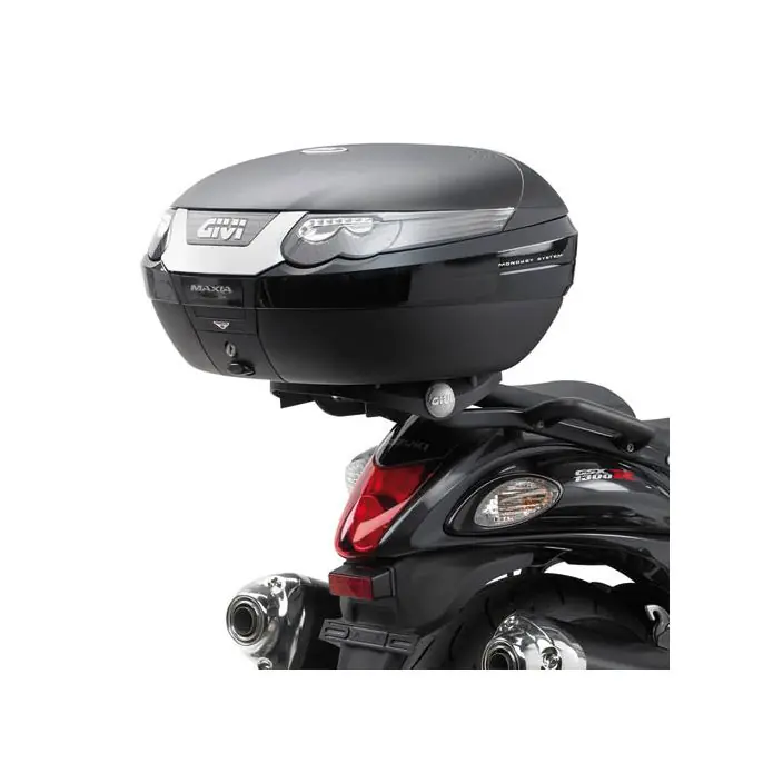 Specifiek achter rek voor de MONOKEY of MONOLOCK topkoffers. Kan gecombineerd worden met MONOKEY M5, M7, M8A of M8B platen, of met de MONOLOCK M5M of M6M platen. Wanneer gecombineerd met M8A of M8B platen kan er geen remlichtkit of afstandsbediening meer gebruikt/gemonteerd worden. De originele passagier handgrepen worden vervangen door de bijgeleverde handgrepen op het GIVI topkofferrek. Is te gebruiken in combinatie met de originele zijkoffer houder.