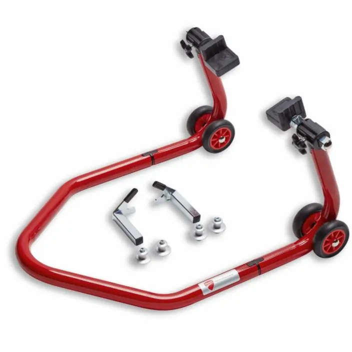 Praktische standaard voorzien van op lagers gemonteerde rubberen wielen, geschikt voor motorfietsen voorzien van een dubbelzijdige swingarm. Uitstekende afwerking en maximale bruikbaarheid. Een belangrijk accessoire voor zowel het circuit als in de garage om de fiets in alle veiligheid op te tillen en te parkeren.
