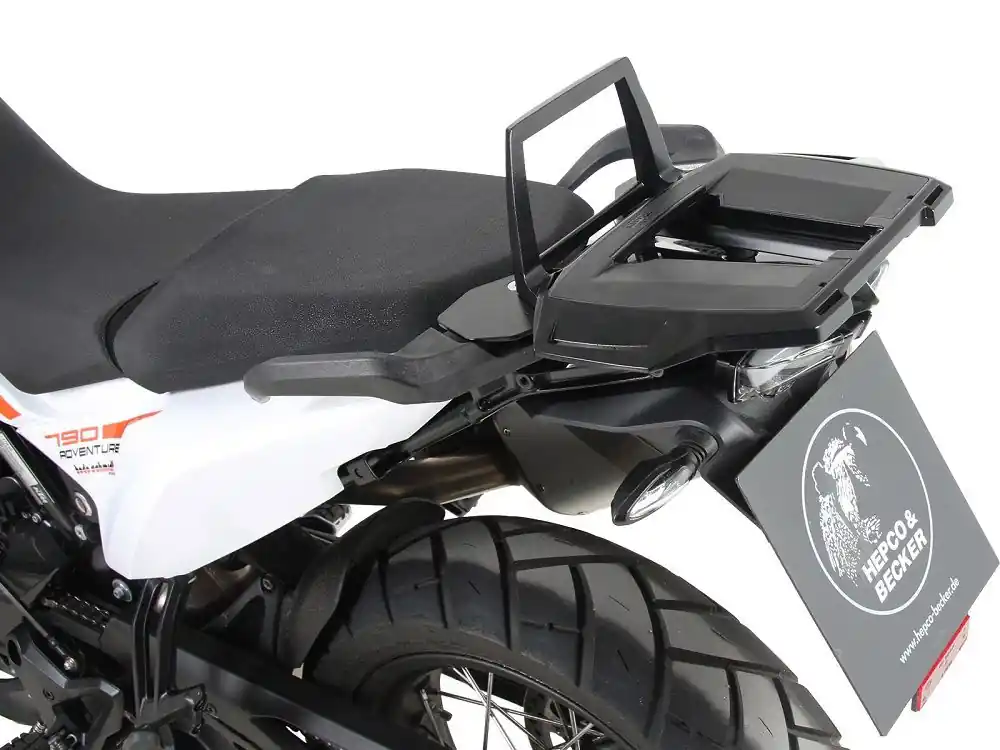 Zeer stabiele drager met niet klapbare opstaande beugel voor topkoffer van Hepco & Becker vervaardigd uit hoogwaardig aluminium in de kleur zwart.