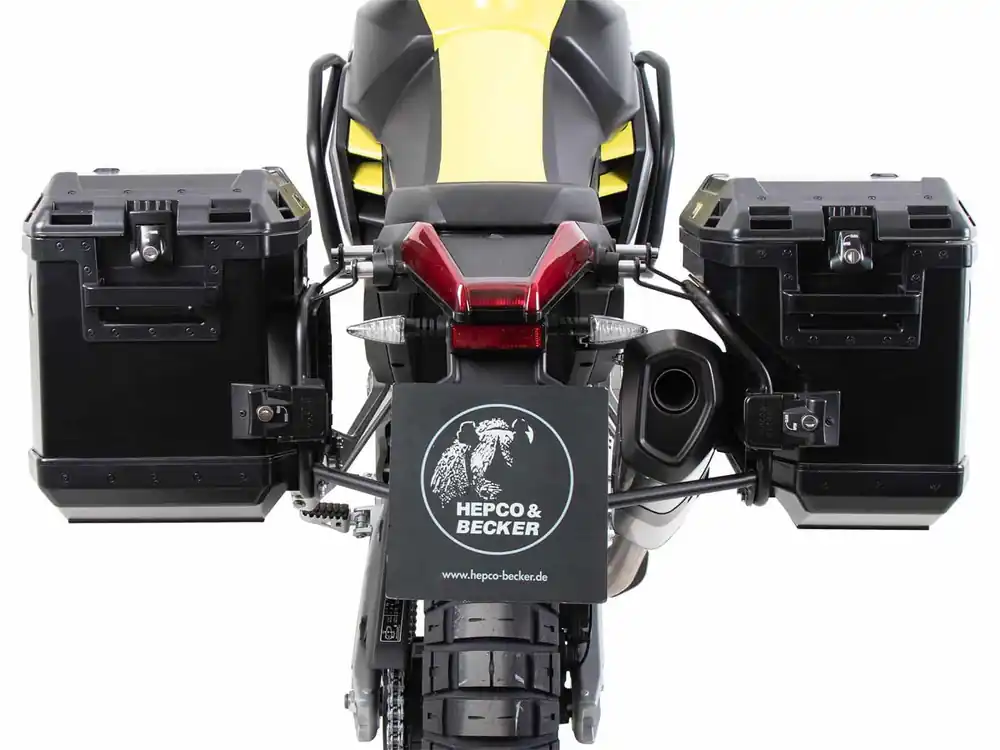 Complete zijkofferset van het kwaliteitsmerk Hepco&Becker, bestaand uit een RVS kofferrek en een set Xplorer zijkoffers (37/40 liter).