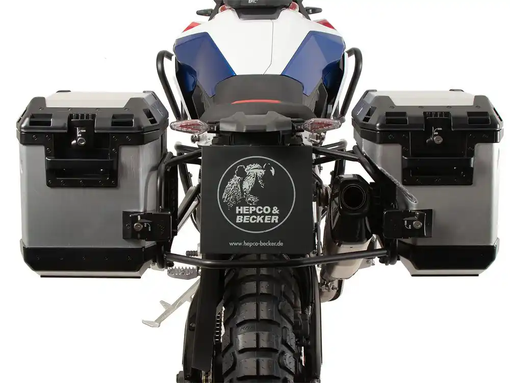 Complete zijkofferset van het kwaliteitsmerk Hepco&Becker, bestaand uit een RVS kofferrek en een set Xplorer zijkoffers (37/40 liter).