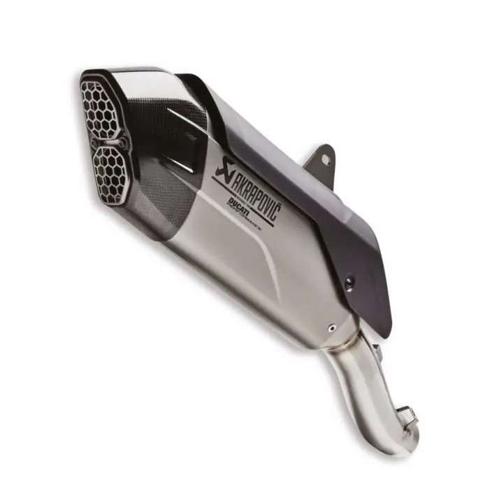 Het onmiskenbare Ducati-ontwerp wordt gecombineerd met het vakkundige vakmanschap van Akrapovič om een exclusief accessoire te creëren dat de motor een agressievere uitstraling geeft. De behuizing van titaniumlegering en de eindkap van koolstofvezel garanderen lichtheid en weerstand tegen hoge temperaturen en zorgen dankzij de honingraatvormige gasuitlaatopeningen voor een nog onmiskenbaarder uiterlijk. De geluiddemper verbetert de vermogen-gewichtsverhouding verder, voor optimale prestaties. De stijl van dit accessoire past perfect bij het design van de fiets en geeft hem een vleugje sportiviteit.
