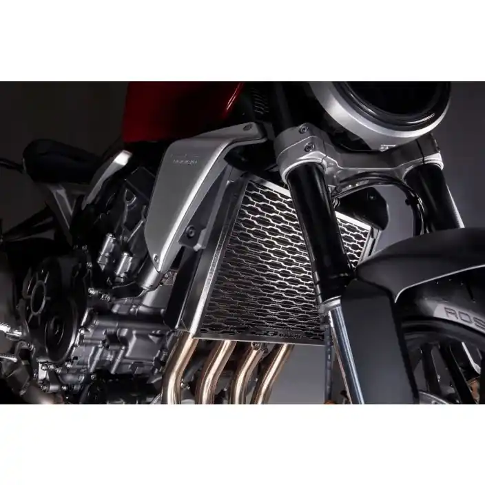 Gemaakt van roestvrij staal, de Radiator Grills verhogen het CB1000R stoere imago. Hun originele gaaspatroon combineert koelvermogen met een bescherming tegen steenslag voor de radiator.