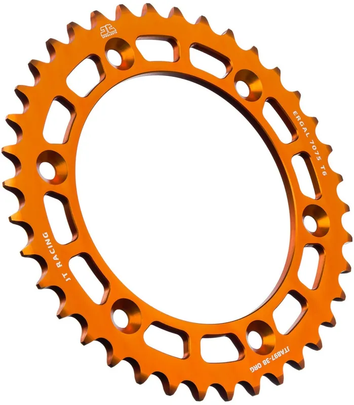 De JT Sprockets REAR RACELITE ALU 38T ORANGE, 520 is een hoogwaardige achtertandwiel, ontworpen voor optimale prestaties en duurzaamheid. Met zijn opvallende oranje kleur en robuuste aluminium constructie, biedt dit tandwiel niet alleen een esthetische upgrade voor je motor, maar ook een significante verbetering in de krachtoverdracht.