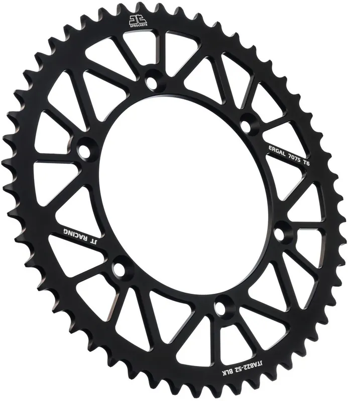 De JT SPROCKETS REAR RACELITE ALU 52T BLACK, 520 is een hoogwaardige achtertandwiel ontworpen voor motoren die op zoek zijn naar een combinatie van kracht en prestaties. Dit sprocket is vervaardigd uit lichtgewicht aluminium, wat bijdraagt aan een efficiëntere acceleratie en betere handling.
