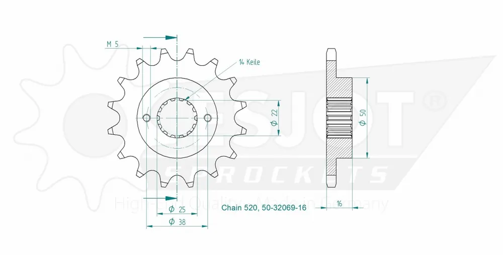 De belangrijkste kenmerken van de ESJOT FRONT 16T, 520 sprocket zijn:
