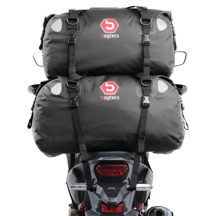 - Set van twee individuele drybag achtertassen met een inhoud van 60L en 40L (totaal volume 100L)