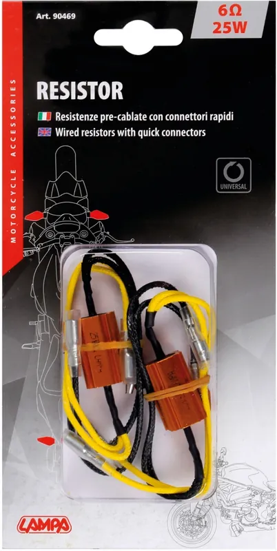 De WIRED RESISTORS QUICK CONNECTORS van LAMPA zijn essentiële componenten voor jouw motor- of scooterindicator. Deze weerstanden zijn ontworpen voor een optimale werking van je voertuigverlichting, waardoor je altijd veilig de weg op kunt.