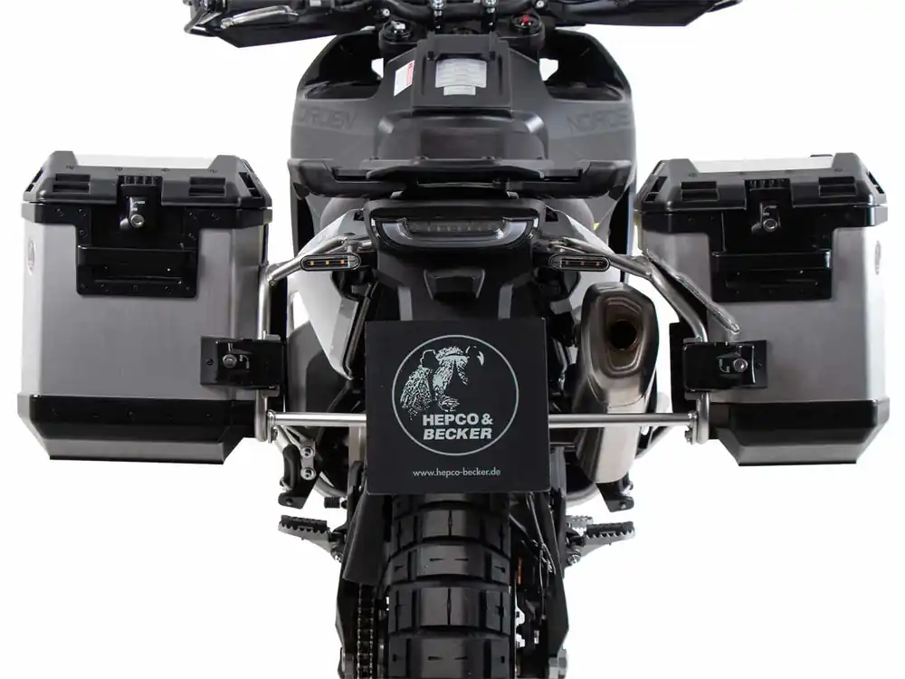 Complete zijkofferset van het kwaliteitsmerk Hepco&Becker, bestaand uit een RVS kofferrek en een set Xplorer zijkoffers (37/40 liter).