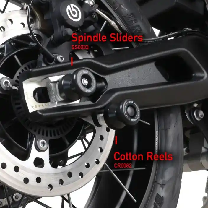 Wanneer er geen schroefdraad in de achterbrug is om een bobbin te monteren kan de R&G “Offset Cotton Reels” gebruikt worden. Zo kan er via de kettingspanner/achteras toch een bobbin op de motor gemonteerd worden en kan de motor dus met een paddockstand veilig en stevig gestald worden. Ook beschermen de bobbins de achterbrug bij een val.