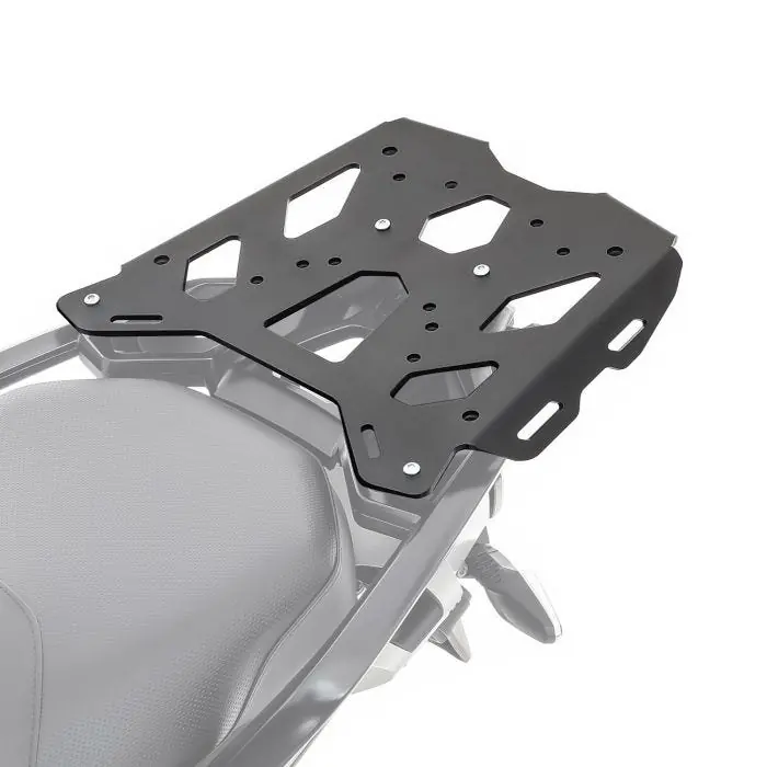 - Groot steunvlak en sjorogen aan de zijkant vereenvoudigen de bevestiging van zachte bagage zoals bagagerollen en achtertassen met behulp van spanbanden