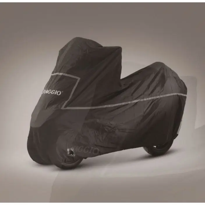 Beschermhoes met openingen voor accessoires. Kleur zwart met reflector strip, transparante kentekenplaat venster. Voorzien van het Piaggio logo. Speciaal ontworpen voor de Piaggio MP3 en X10.