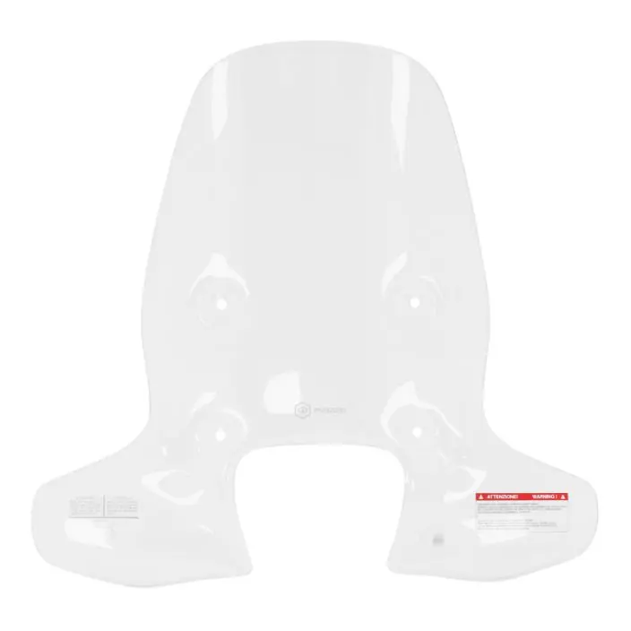 Schokbestendig windscherm van metacrylaat, dikte 4 mm. Compacte maat. Geintegreerde handbeschermers. Standaard verchroomde assen. Getest en goedgekeurd door Piaggio. Met Piaggio-logo.