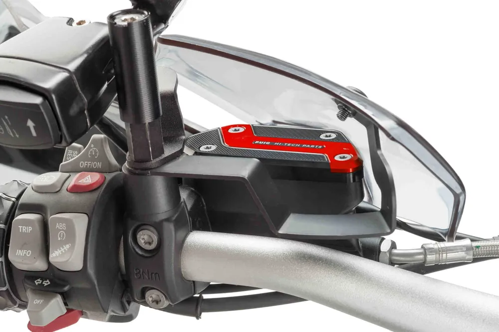 Puig remvloeistofreservoir deksel voor de voorrem vervaardigd uit massief aluminium en leverbaar in diverse kleuren.