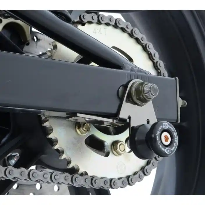 Wanneer er geen schroefdraad in de achterbrug is om een bobbin te monteren kan de R&G “Offset Cotton Reels” gebruikt worden. Zo kan er via de kettingspanner/achteras toch een bobbin op de motor gemonteerd worden en kan de motor dus met een paddockstand veilig en stevig gestald worden. Ook beschermen de bobbins de achterbrug bij een val.