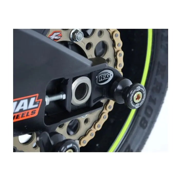 Wanneer er geen schroefdraad in de achterbrug is om een bobbin te monteren kan de R&G “Offset Cotton Reels” gebruikt worden. Zo kan er via de kettingspanner/achteras toch een bobbin op de motor gemonteerd worden en kan de motor dus met een paddockstand veilig en stevig gestald worden. Ook beschermen de bobbins de achterbrug bij een val.