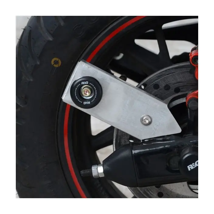 Wanneer er geen schroefdraad in de achterbrug is om een bobbin te monteren kan de R&G “Offset Cotton Reels” gebruikt worden. Zo kan er via de kettingspanner/achteras toch een bobbin op de motor gemonteerd worden en kan de motor dus met een paddockstand veilig en stevig gestald worden. Ook beschermen de bobbins de achterbrug bij een val.