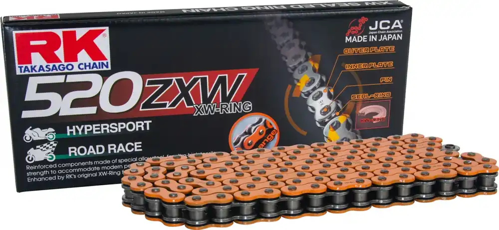 Deze ketting is gemaakt van **ultra versterkt** materiaal, wat zorgt voor een langere levensduur en betere duurzaamheid, zelfs onder zware omstandigheden. De opvallende **oranje kleur** geeft je motor niet alleen een unieke uitstraling, maar zorgt ook voor een visuele identificatie van de kwaliteit die RK biedt.