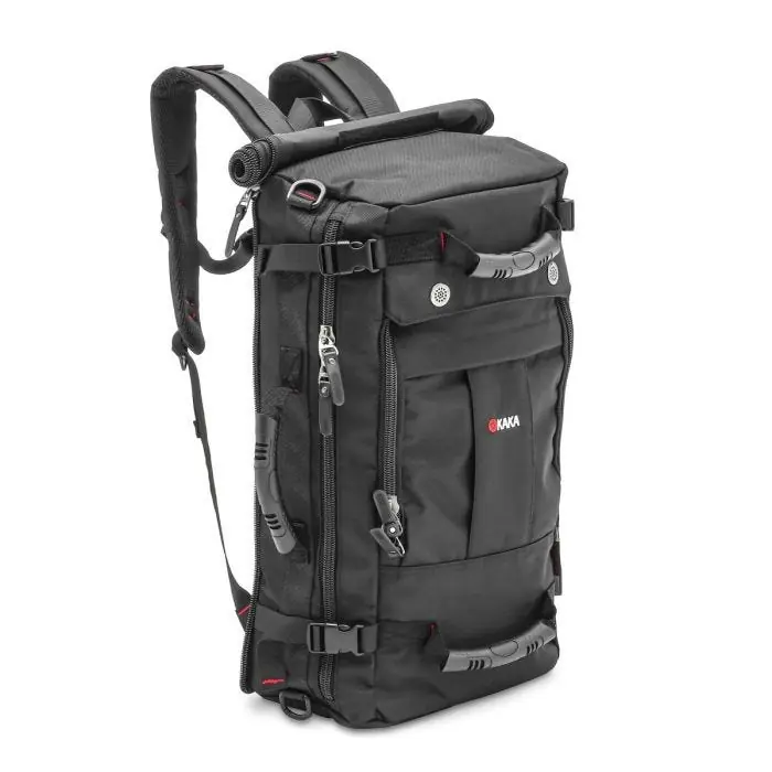 - De schouderbanden kunnen worden afgedekt met een hoes, waardoor de rugzak een achtertas of reistas wordt zonder rondhangende riemen