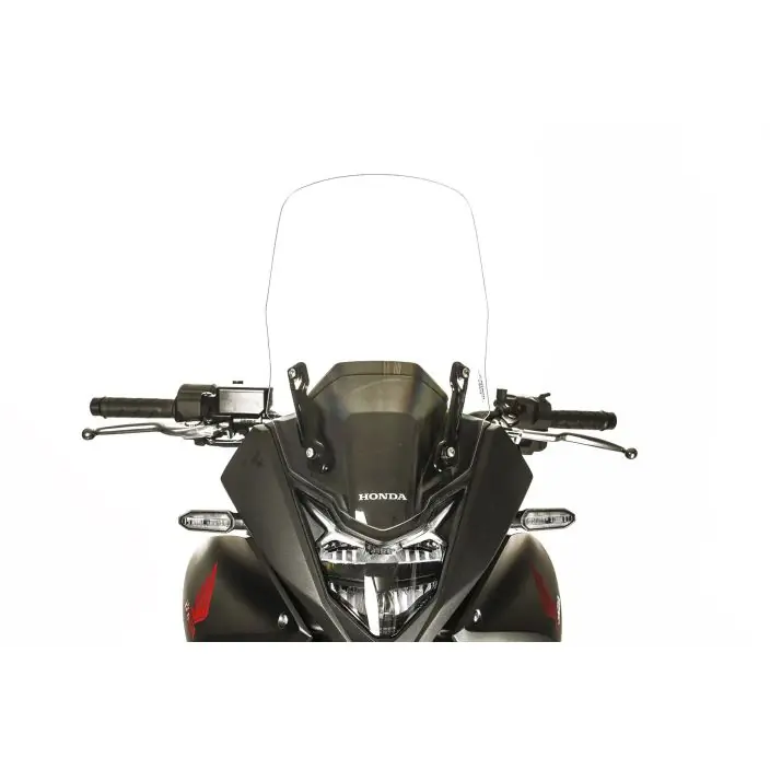 De hoogte van het normale scherm wordt met 75 mm verlengd voor dit accessoire, dat het comfort voor rijder en passagier verhoogt door maximale bescherming tegen weer en wind. Het gecoate sterke polycarbonaat oppervlak met het Honda logo is krasbestendig. Geen extra hardware nodig voor de installatie aangezien het direct wordt gemonteerd ter vervanging van het standaard scherm. Materiaal: Hard gecoat polycarbonaat Kleur: Helder