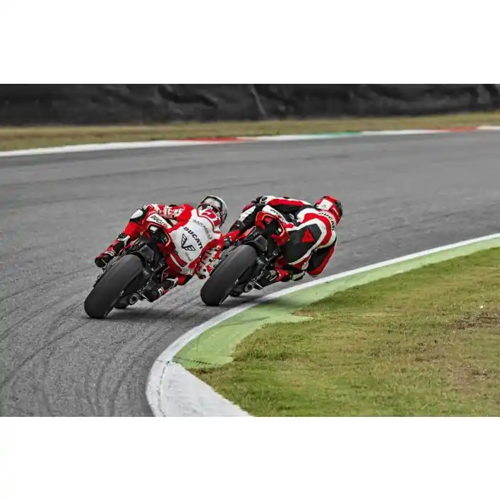 De Evo 3 Ducati Traction & Wheelie Control for Racing-banden is nu beschikbaar voor de Panigale V4 R. Ontwikkeld in samenwerking met Ducati Corse-technici om de raceprestaties aanzienlijk te verbeteren, zowel bij gladheid als bij regen, in geval van regen. EVO3 is een verdere evolutie van Ducati Traction Control, verbeterd met een verfijnde strategie afgeleid van Ducati Corse en zo ontworpen dat het openen van het gaspedaal bij het uitkomen van de bocht nog gemakkelijker en voorspelbaarder wordt. Tijdens deze rijfase kan er een ongewenst en onverwacht slippen van het achterwiel optreden als gevolg van de piekversnelling van de krukas, normaal gesproken aan het einde van de spelingsfase van de aandrijflijn. Dit stoort de berijder terwijl hij het gaspedaal verhoogt bij de maximale hellingshoek. De nieuwe software past voorspellend het koppel aan dat wordt geleverd door Desmosedici Stradale, waardoor de hoekversnelling van de krukas wordt gekalibreerd, zodat de herstelfase soepel verloopt. Dit resulteert in een neutraler rijgedrag bij het verlaten van bochten met een betere controle en rijgevoel voor de berijder. Bovendien kan de berijder het gaspedaal gebruiken om meer in te grijpen op het slippen van het achterwiel dan op het “normale” niveau, door meer op het voorwiel te draaien en de baan van de bocht te sluiten. Daarom maakt het systeem het mogelijk om met het achterwiel te sturen, in veilige omstandigheden en met een minimaal risico om de controle over de fiets te verliezen. Hij kan alleen worden gebruikt met een race-uitlaat en kan worden ingesteld op 8 verschillende standen (5 voor droge baan en 3 voor natte baan en regenbanden). Concreet zorgen DTC EVO 3 niveaus 1, 2 en 3 voor een mate van controle over de fiets die alleen toegankelijk was voor professionele rijders. Een exclusieve software waarmee elke rijder de besturingsstrategie kan aanpassen aan zijn/haar eigen rijstijl en gripcondities, om zo topprestaties te behalen.