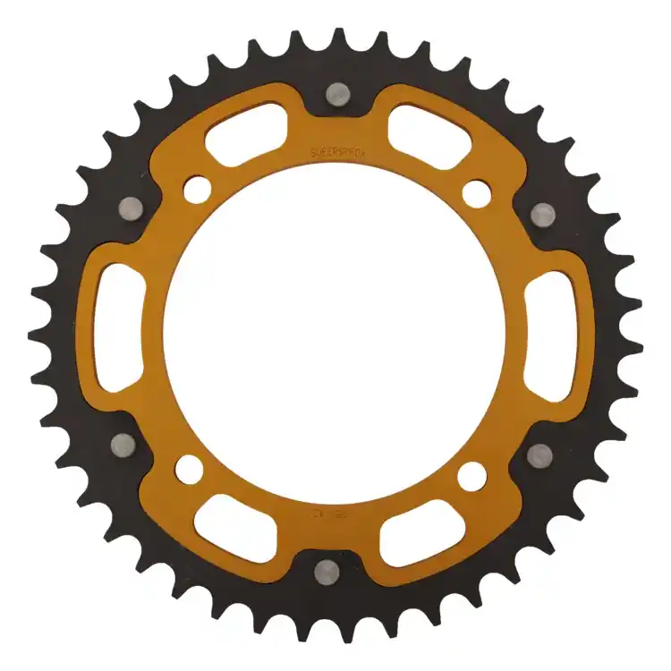 De SUPERSPROX REAR STEALTH 43T in een opvallende gouden kleur is een hoogwaardige achtertandwiel, ontworpen om prestaties te verbeteren. Met een tandenaantal van 43T biedt dit sprocket optimale kracht en acceleratie voor jouw motor of scooter.